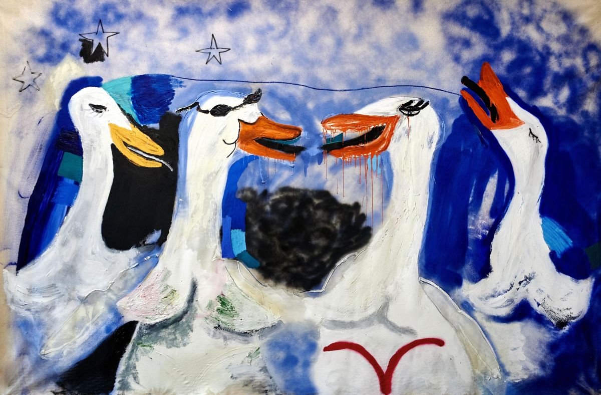 Pastel, oil, spray-paint, acrylic on canvas.