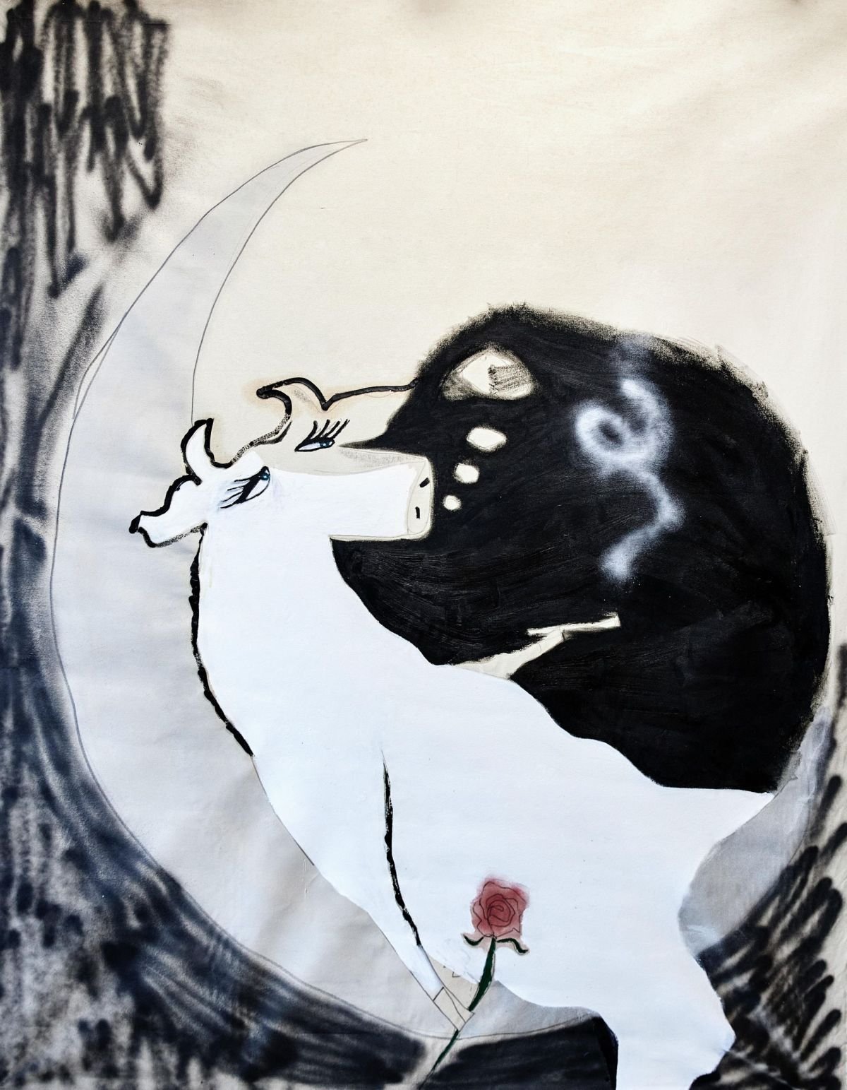 Acrylic, spray-paint, oil, pastel, pencil on canvas.